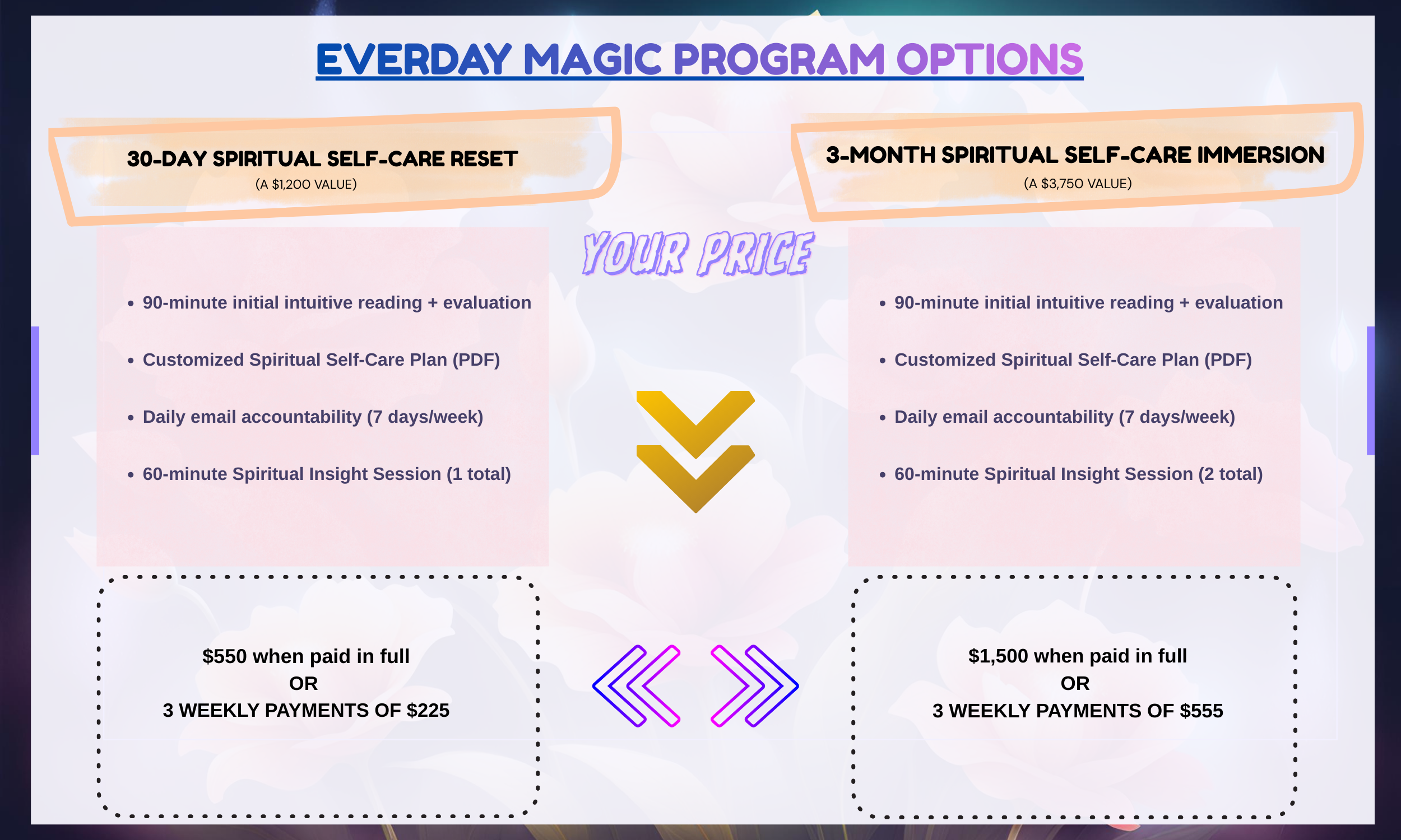 Your 30 or 90 Day experience officially begins once you receive your Custom Spiritual Self-Care Plan either on Feb 1st or within a week of your session.